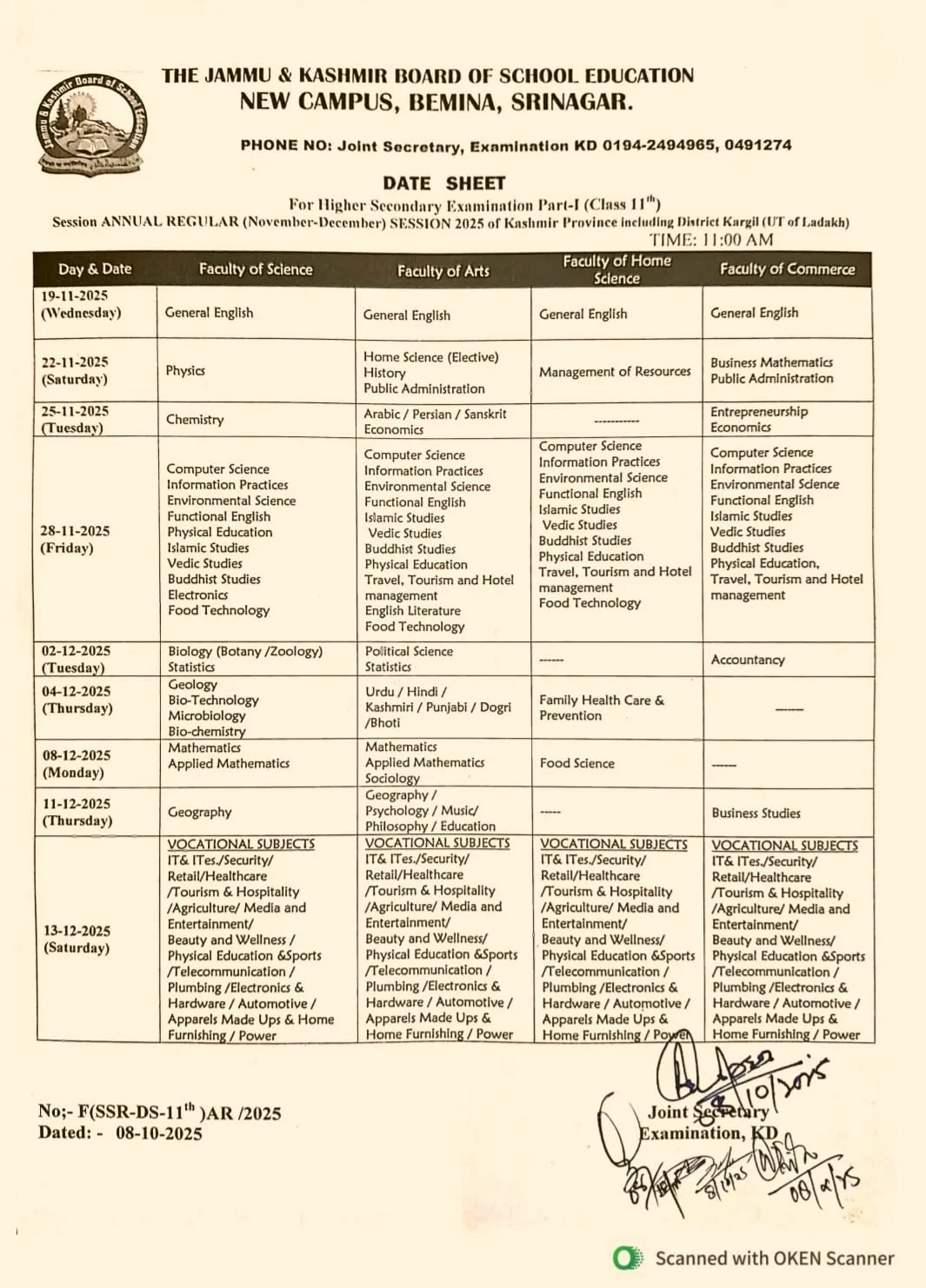 Note: As per notification No. F(SSR-DS-11th)AR/2025 dated 08-10-2025, issued by the Joint Secretary, Examination KD, JKBOSE New Campus Bemina, Srinagar.