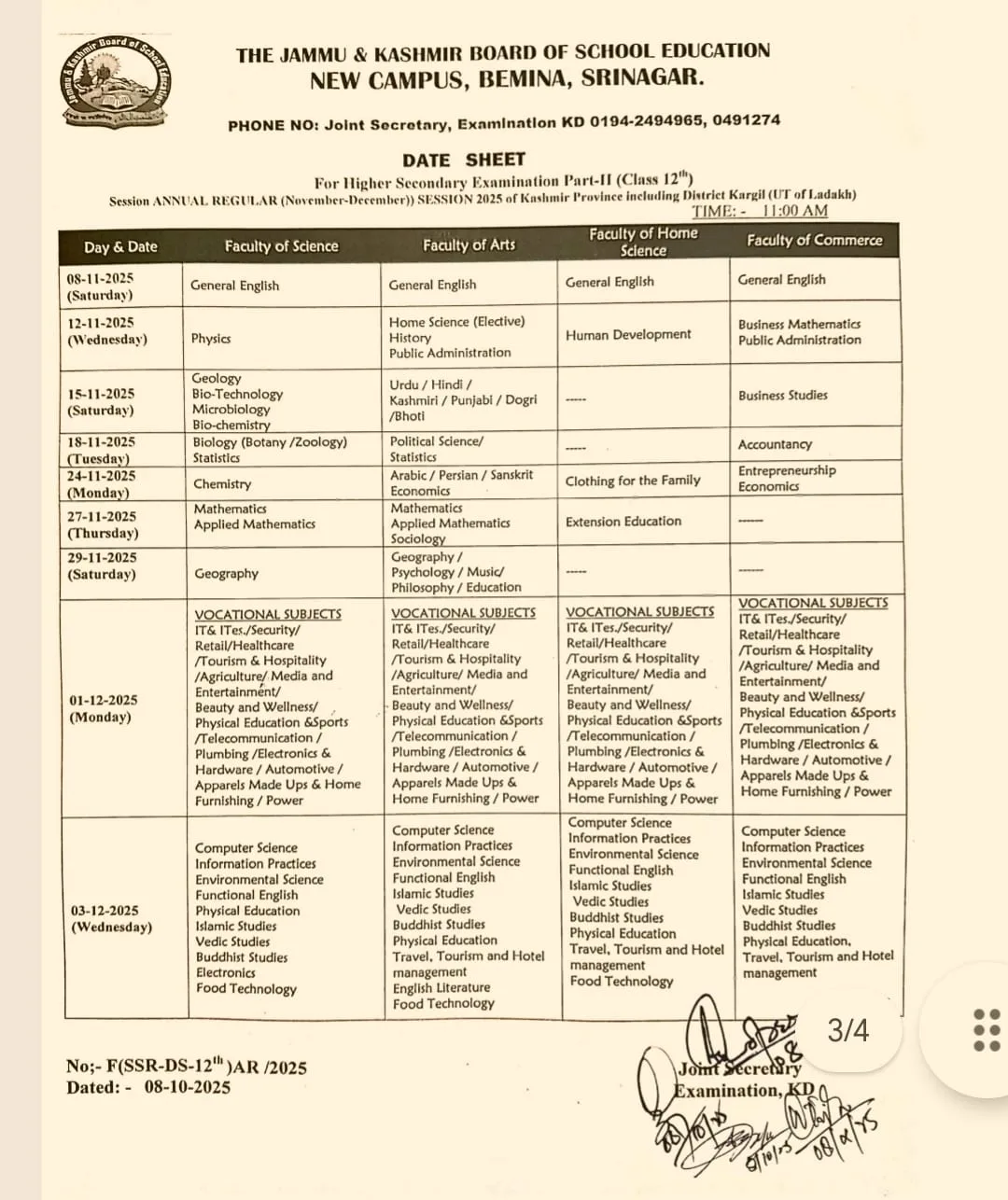 Note: As per notification No. F(SSR-DS-12th)AR/2025 dated 08-10-2025, issued by the Joint Secretary, Examination KD, JKBOSE New Campus Bemina, Srinagar.